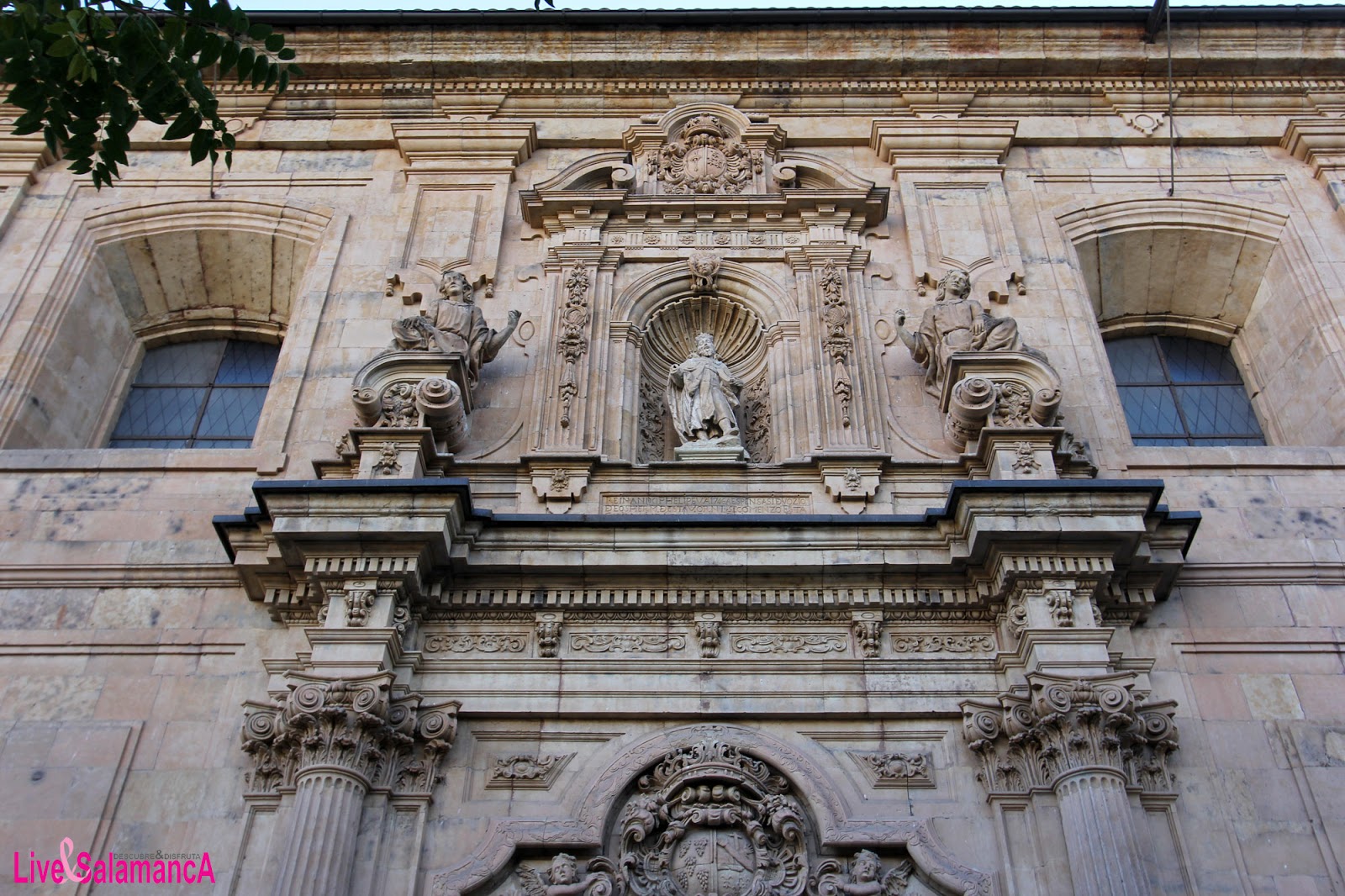 En el exterior la portada muestra un barroco más sereno, excepto en la dinámica moldura de la puerta; en el centro de la parte superior en una hornacina avenerada, se encuentra la imagen de San Luis Rey flanqueado por dos figuras sobre volutas obra de Simón Gavilán Tomé y Gregorio Carnicero.