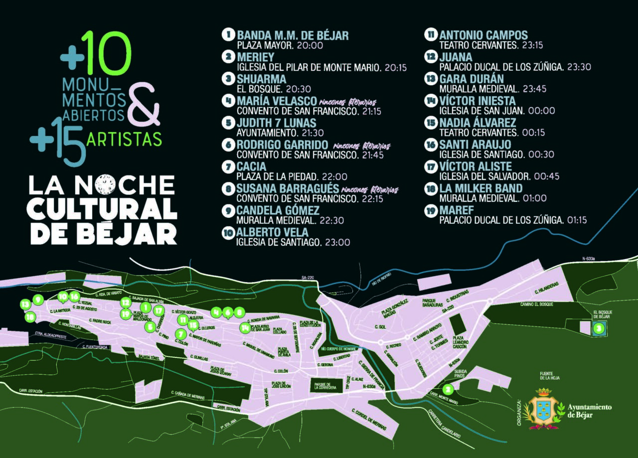 La programación de la Noche Cultural de Béjar reunirá a reconocidos artistas locales y nacionales, con una amplia variedad de estilos musicales y propuestas escénicas. Algunos de los nombres que participarán en esta edición son: